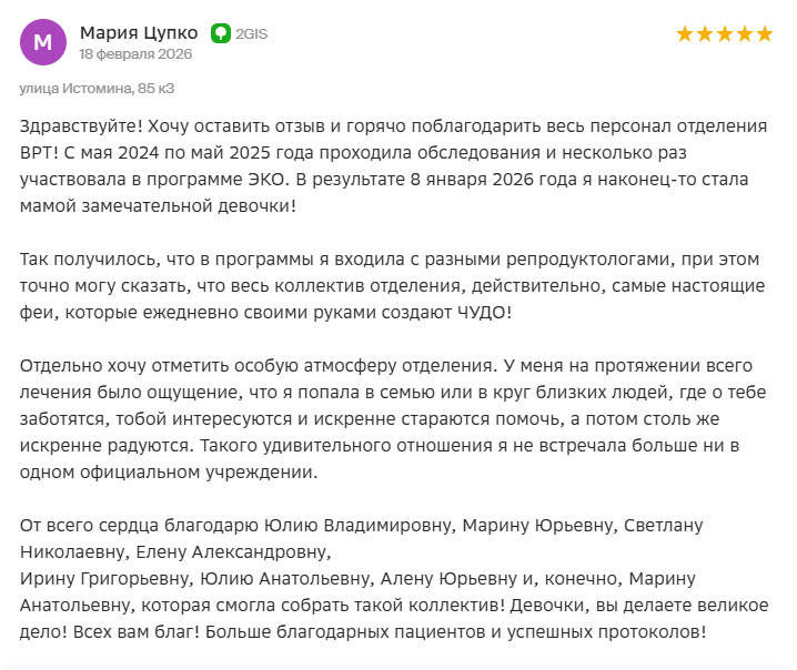 Здравствуйте! Хочу оставить отзыв и горячо поблагодарить весь персонал отделения ВРТ! С мая 2024 по май 2025 года проходила обследования и несколько раз участвовала в программе ЭКО. В результате 8 января 2026 года я наконец-то стала мамой замечательной девочки!